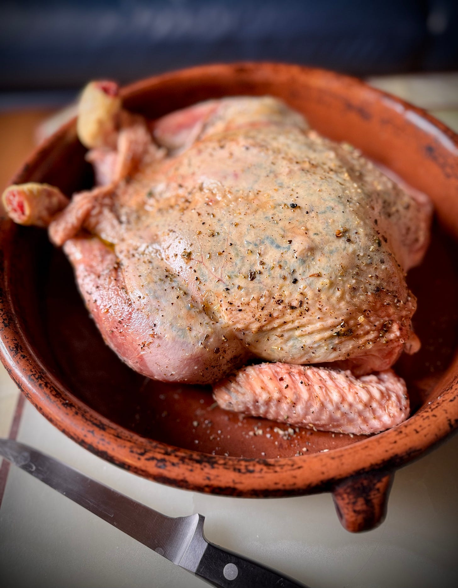 Transfer the bird to a large casserole (a round terra cotta type like the Spanish cazuela being ideal) and bake in the lower half of a 450F/230C oven for ten minutes before reducing the heat to 375F/190C for 1-1.5 hours until the inner thigh reads 195F/90C. Should the breast arrive early to the browning party (every oven is different), tent with foil. Let rest before carving at table.