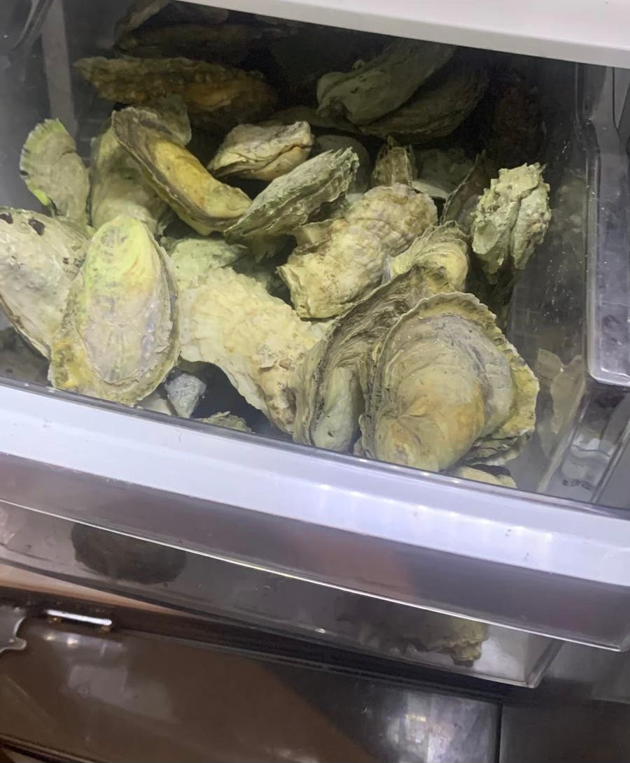 What else to use up in a dead fridge? Scrounging around the top shelf, among the containers of sambal oelek, gochujang, chunjang, doubanjiang and pickled Sichuan heaven-facing chiles (all of which I figured would be fine at room temp for a week), there was a jar of mignonette sauce that I think I made a year ago. It seemed okay—basically it’s shallots in vinegar—and while normally I’m a lemon juice purist with my oysters (I keep mignonette around for guests) I decided my dead fridge indicated it was a good time to use it up. Covering all my bases, I picked a few lemons.