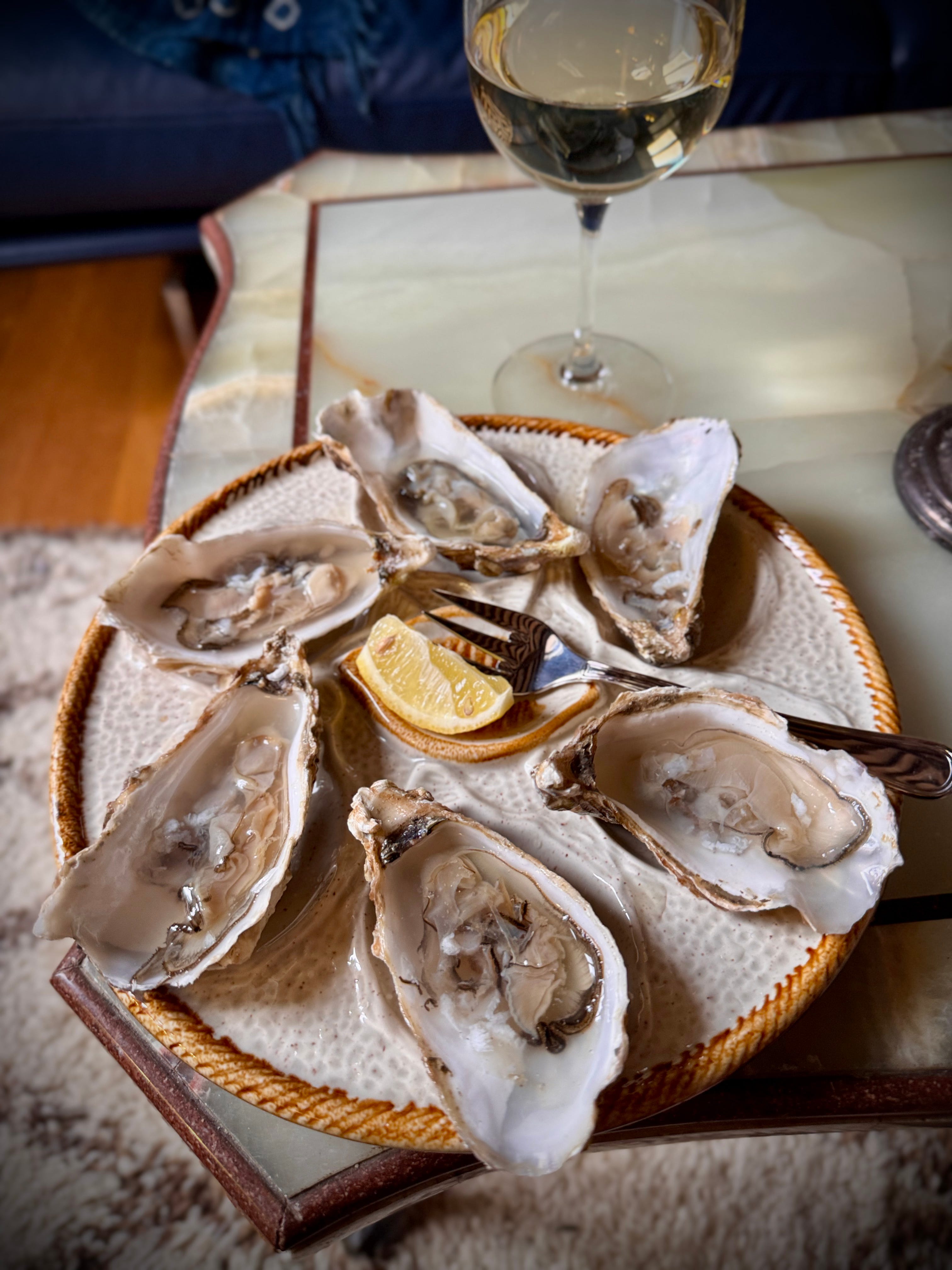 Two days earlier I had bought a couple dozen Normandy oysters, which can last a few weeks in the coldest bottom compartment of a refrigerator (cup side down, covered with a damp cloth) but only if it’s really cold, like just above freezing. Outdoor temps here during the daytime have been reaching 15C/60F which is too warm for oysters, so they had to meet the knife, soon.