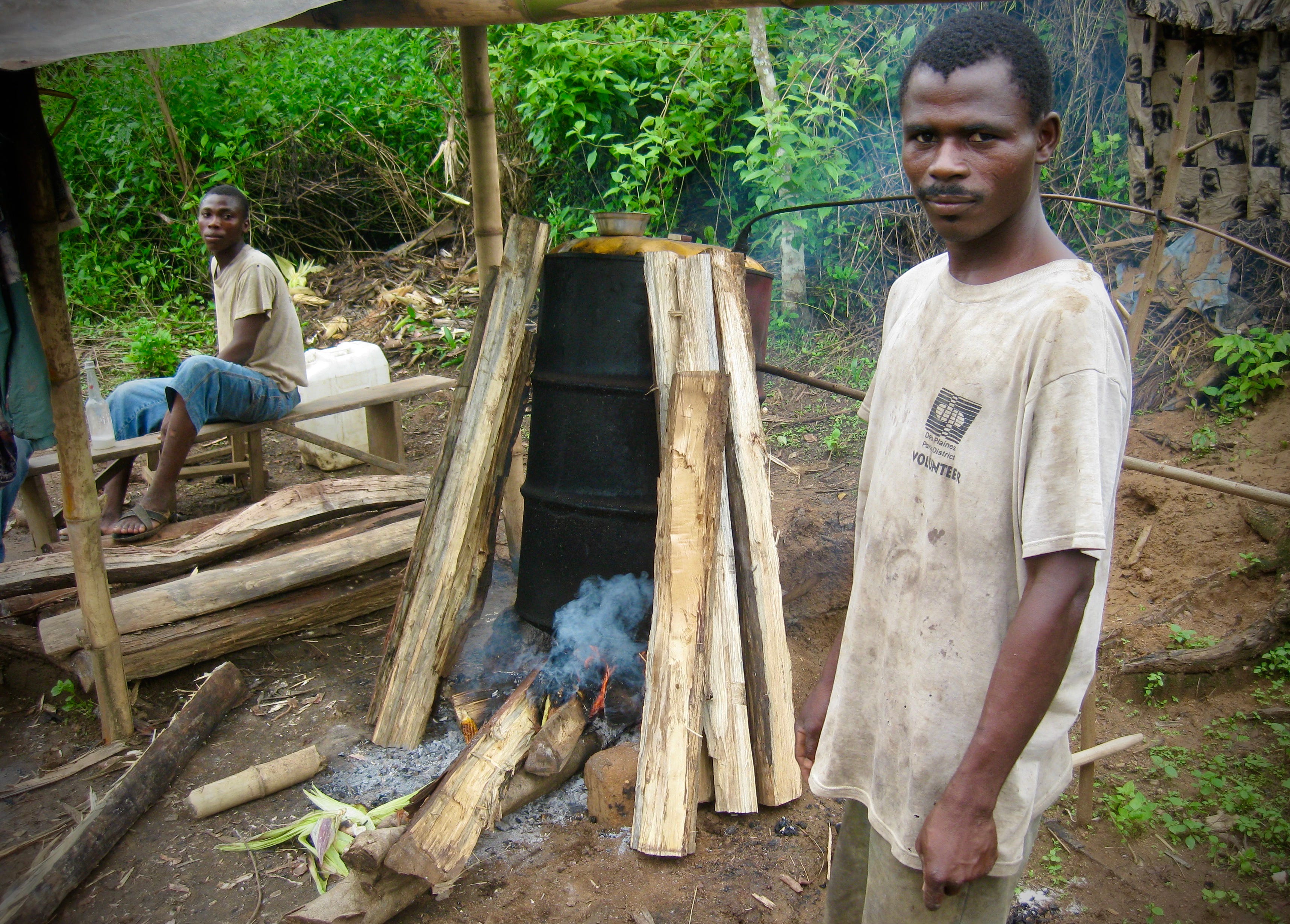 Deep in the bush near Koforidua, driving our Tata pickup along a rutted red dirt track, I saw the setup in a clearing between banana trees. Under a canopy of rusty corrugated roofing sat a blackened fifty-five-gallon oil drum perched on rocks above a fire, two more barrels connected to it by a battered copper pipe. A guy in a grimy American charity t-shirt (“Des Plaines Park District Volunteer”) was feeding four-foot-long mahogany trunks into the fire, which enveloped him in smoke.